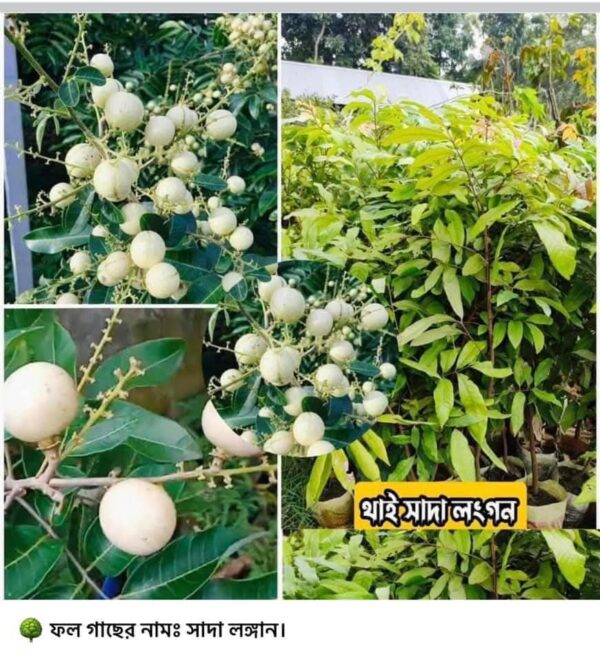 থাই সাদা লংগান (White Longan) হলো থাইল্যান্ডের একটি জনপ্রিয় মিষ্টি ফল, যা লিচু জাতীয় ফল হিসেবে পরিচিত। এর প্রধান বৈশিষ্ট্য হলো এর সাদা, রসালো ও অত্যন্ত মিষ্টি শাঁস এবং ছোট বীজ। এই গাছের চারা বাংলাদেশে পাওয়া যায় এবং এটি দেশের বিভিন্ন গ্রীষ্মপ্রধান অঞ্চলের জন্য উপযোগী।